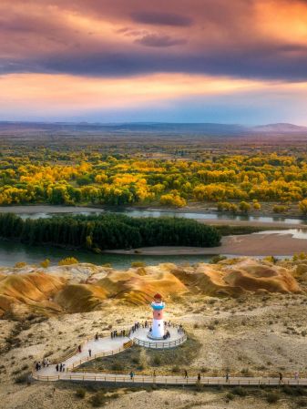 16:30-20:00前往游覽五彩灘景區(qū),沿著棧道前進(jìn),一邊是干旱風(fēng)蝕的紅土丘陵,一邊是綠洲沙地,遠(yuǎn)處一條吊橋,四周風(fēng)光豐富多彩,讓人目不暇接,仿若走進(jìn)一個五彩斑斕夢幻般的世界